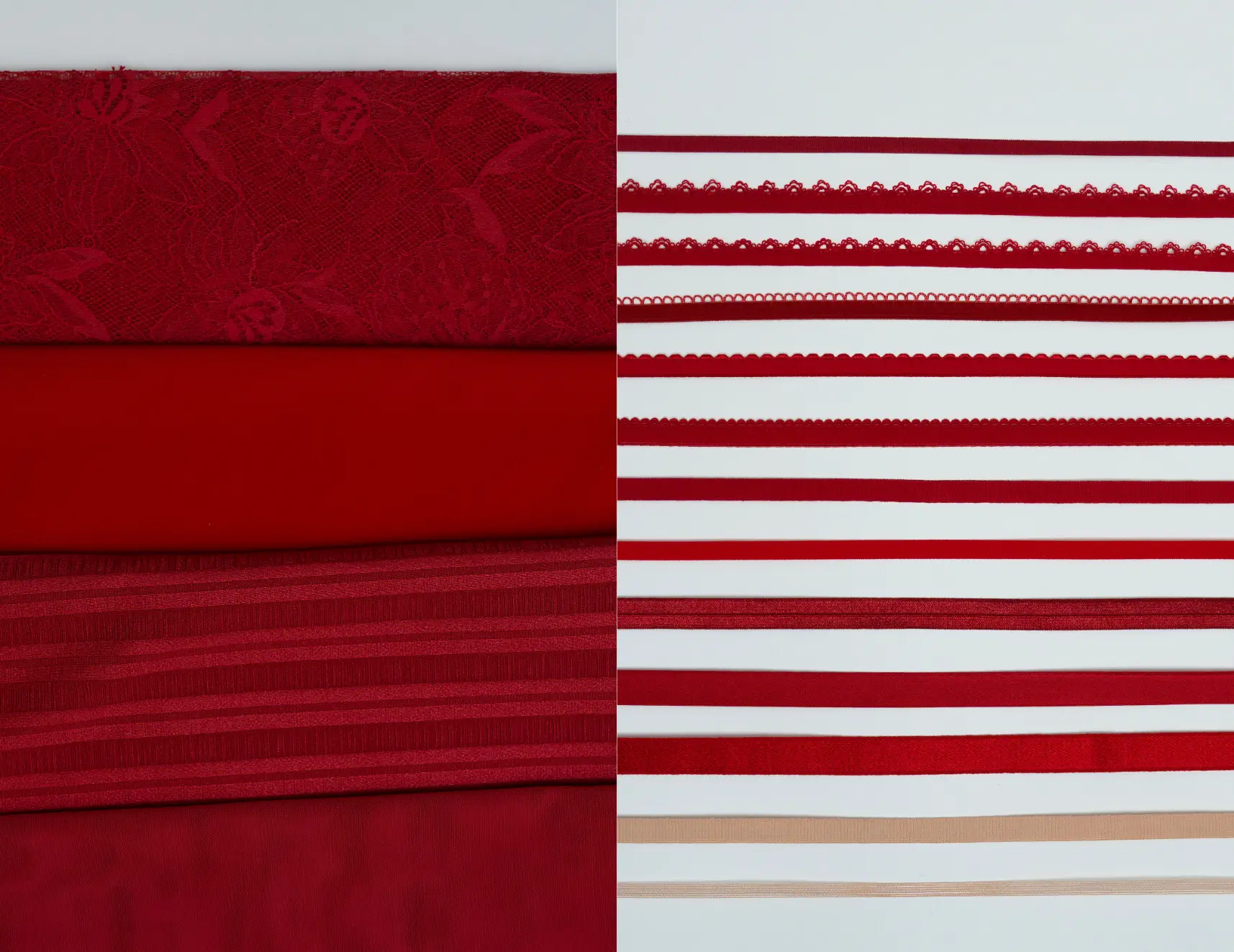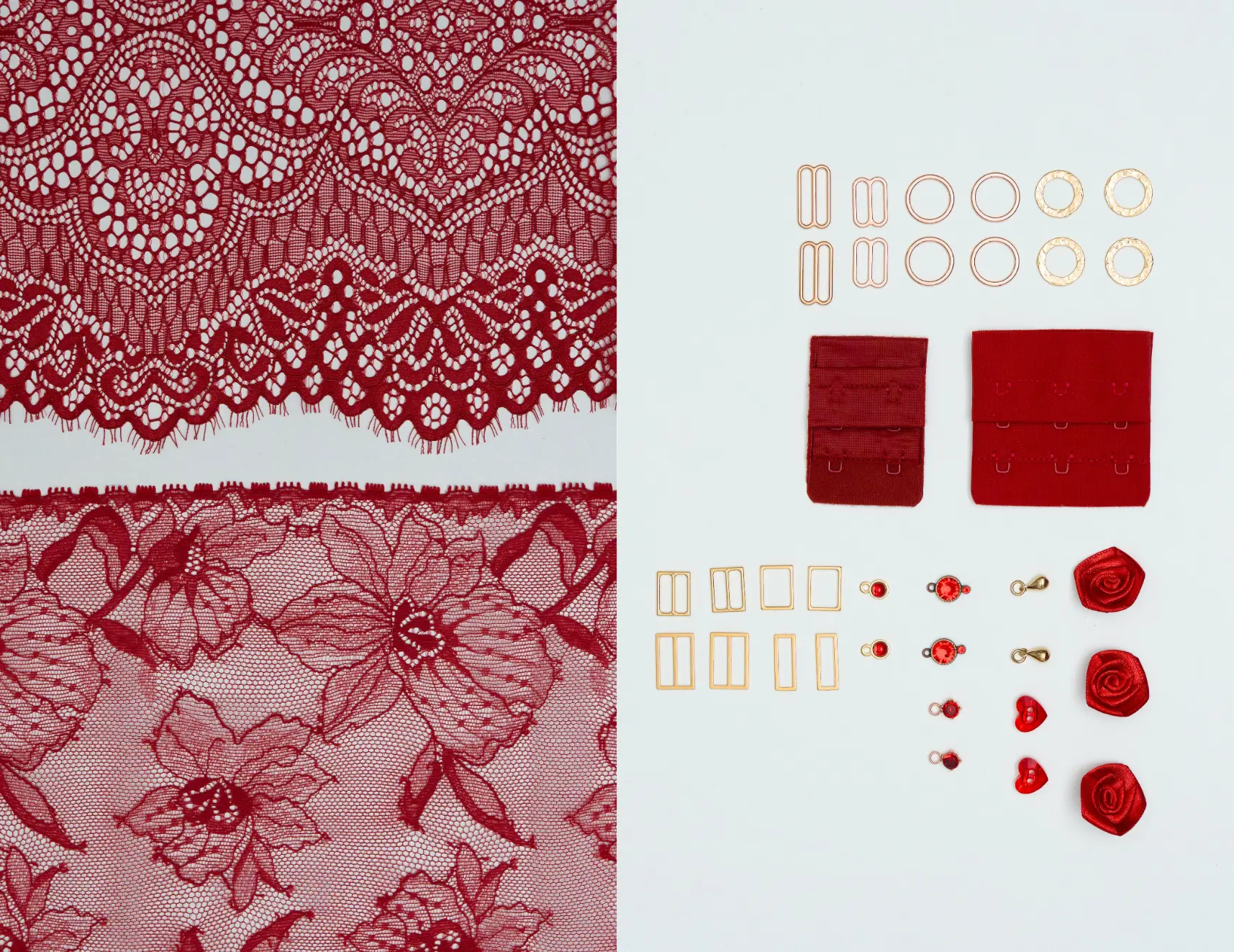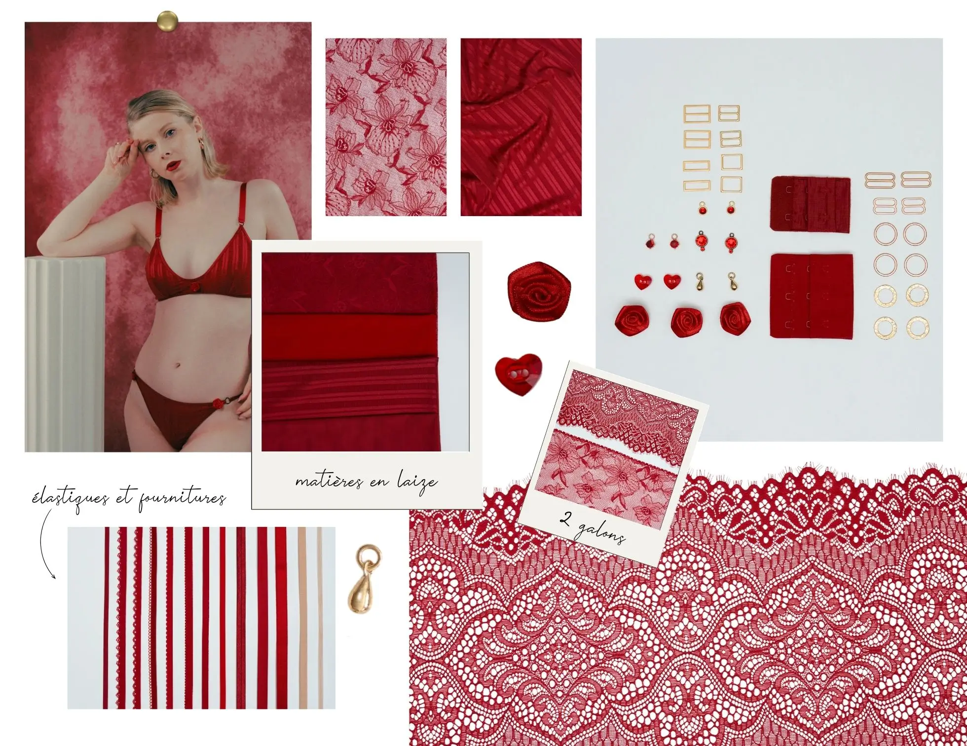 Dans votre coffret Amour, découvrez de somptueuses dentelles en laize, des galons délicats ainsi que des bijoux et fournitures dans une palette de rouge.