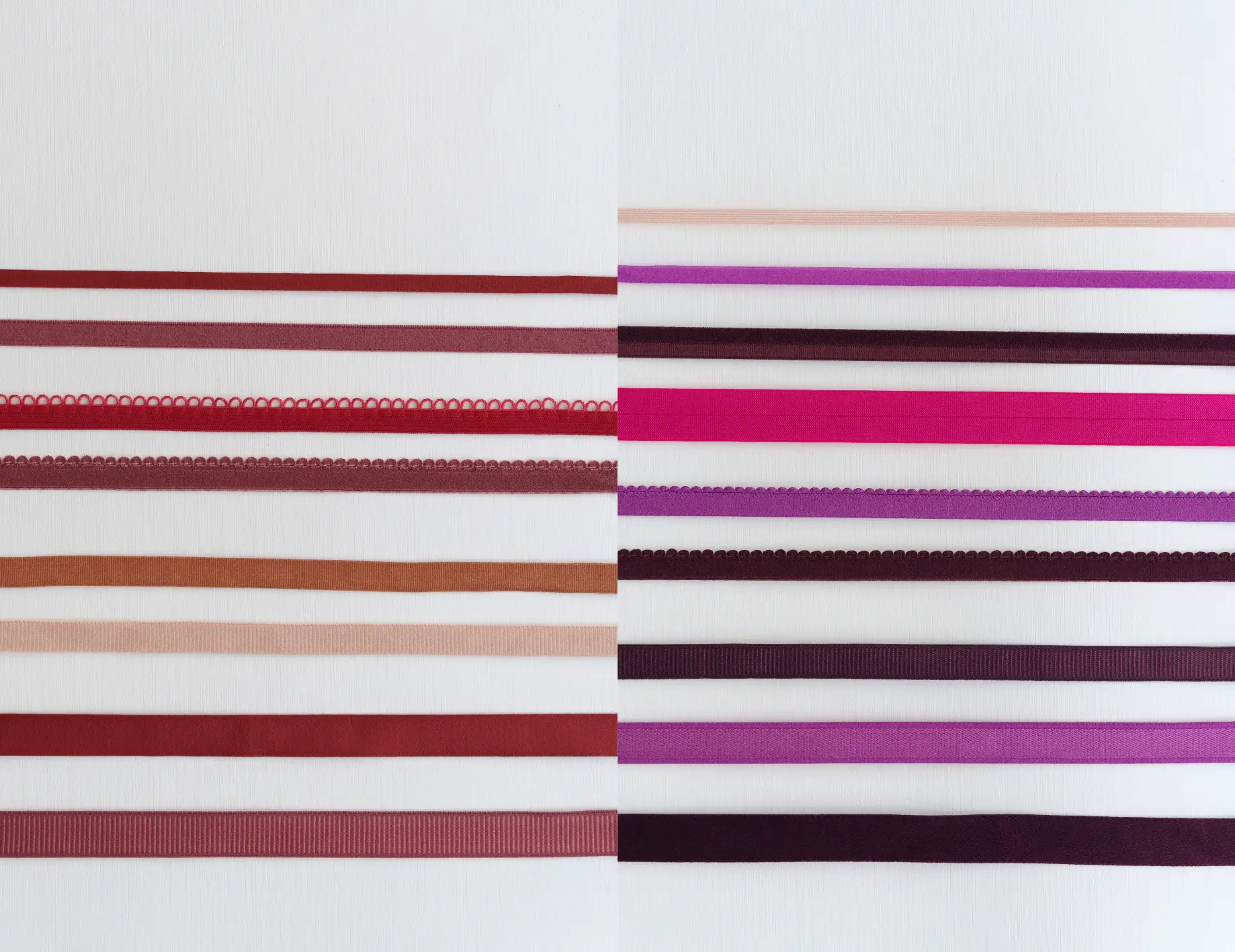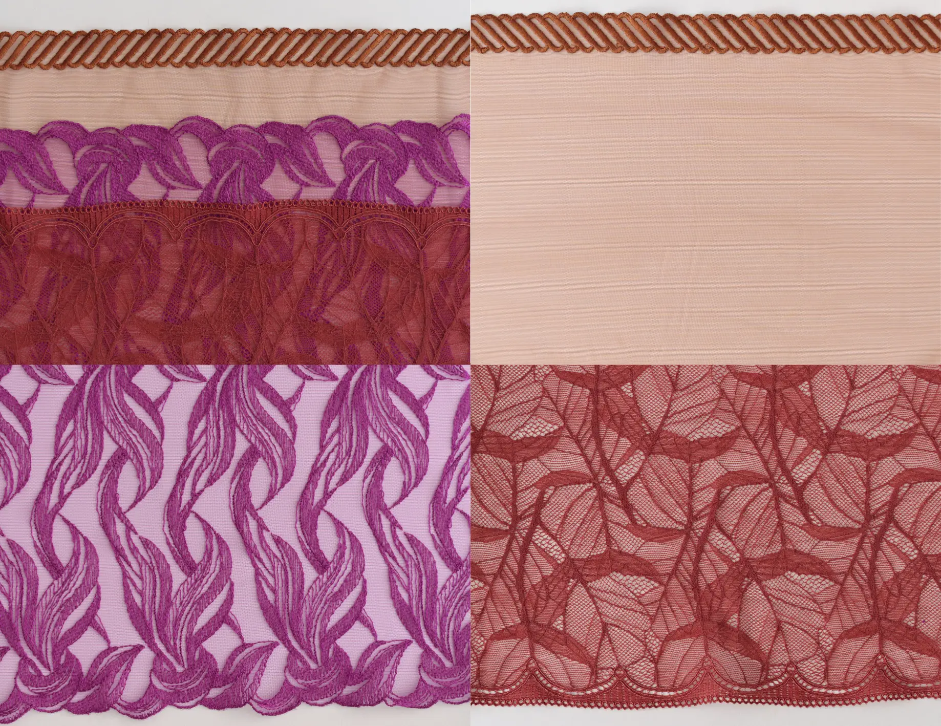 Dans votre coffret Nébula, découvrez de somptueuses dentelles en laize, des galons délicats ainsi que des bijoux et fournitures dans une palette de rose, violet, prune et rouge avec une magnifique résille jungle.
