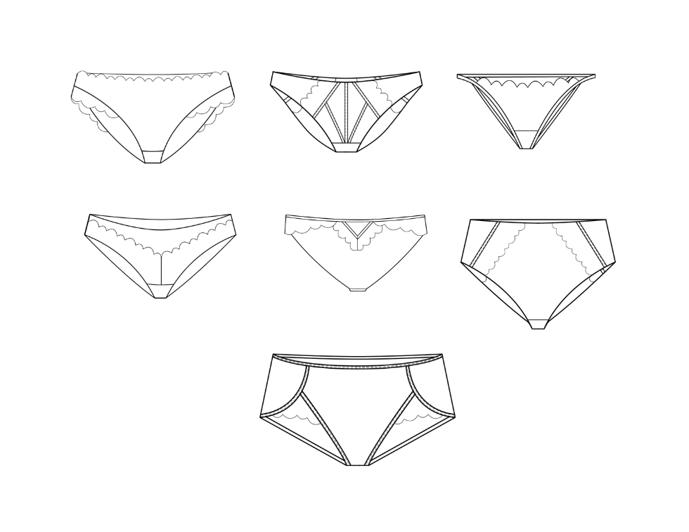 Des tissus, dentelles et détails exclusifs – soigneusement sélectionnés pour vous permettre de réaliser 7 bas uniques, et pourquoi pas, leurs brassières assorties.