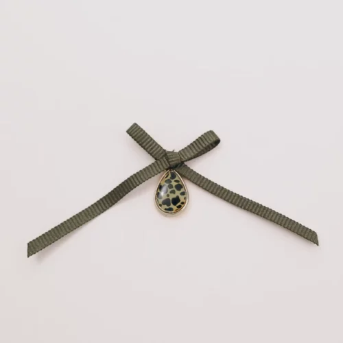 Audacieux et raffiné, ce grand nœud fin kaki s’orne d’un bijou léopard pour une touche de caractère unique.
