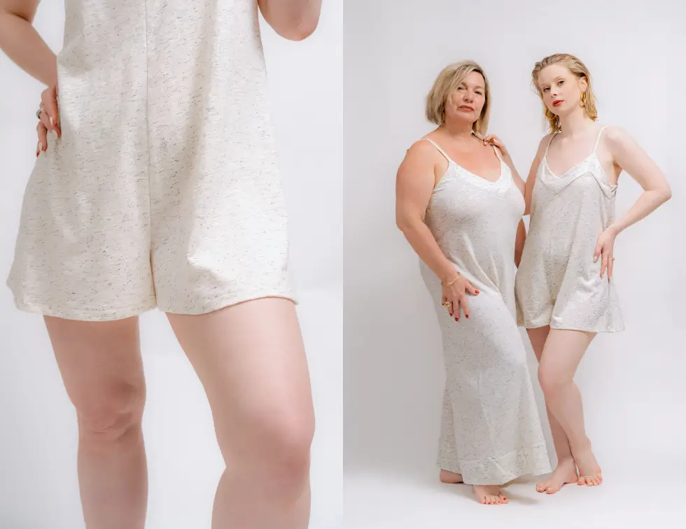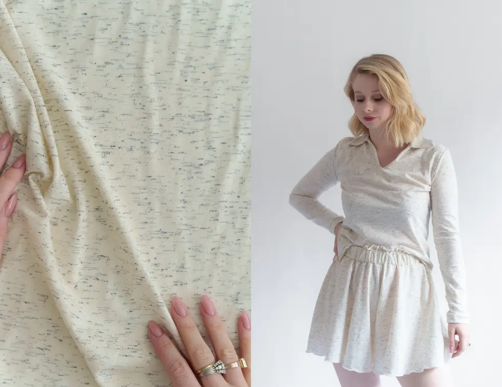Jersey de coton écru moucheté, parfait pour réaliser nos patrons aussi bien en body qu’en prêt-à-porter ou en lingerie.