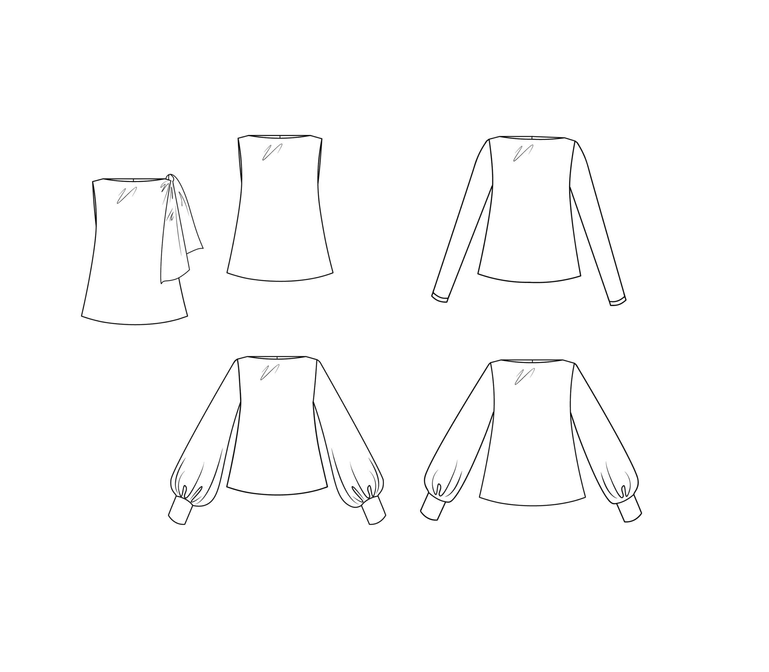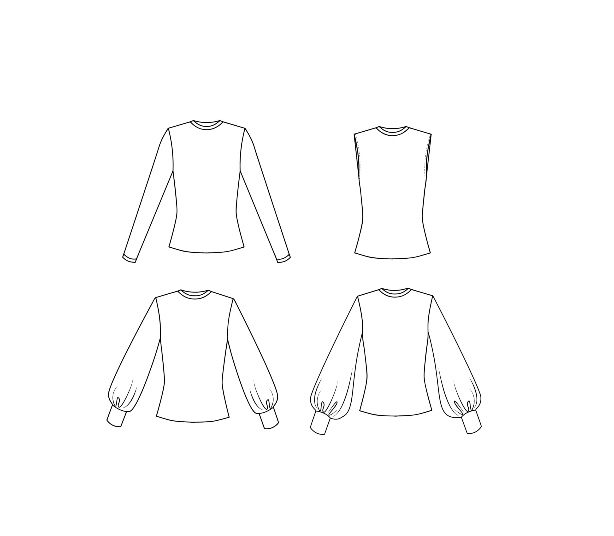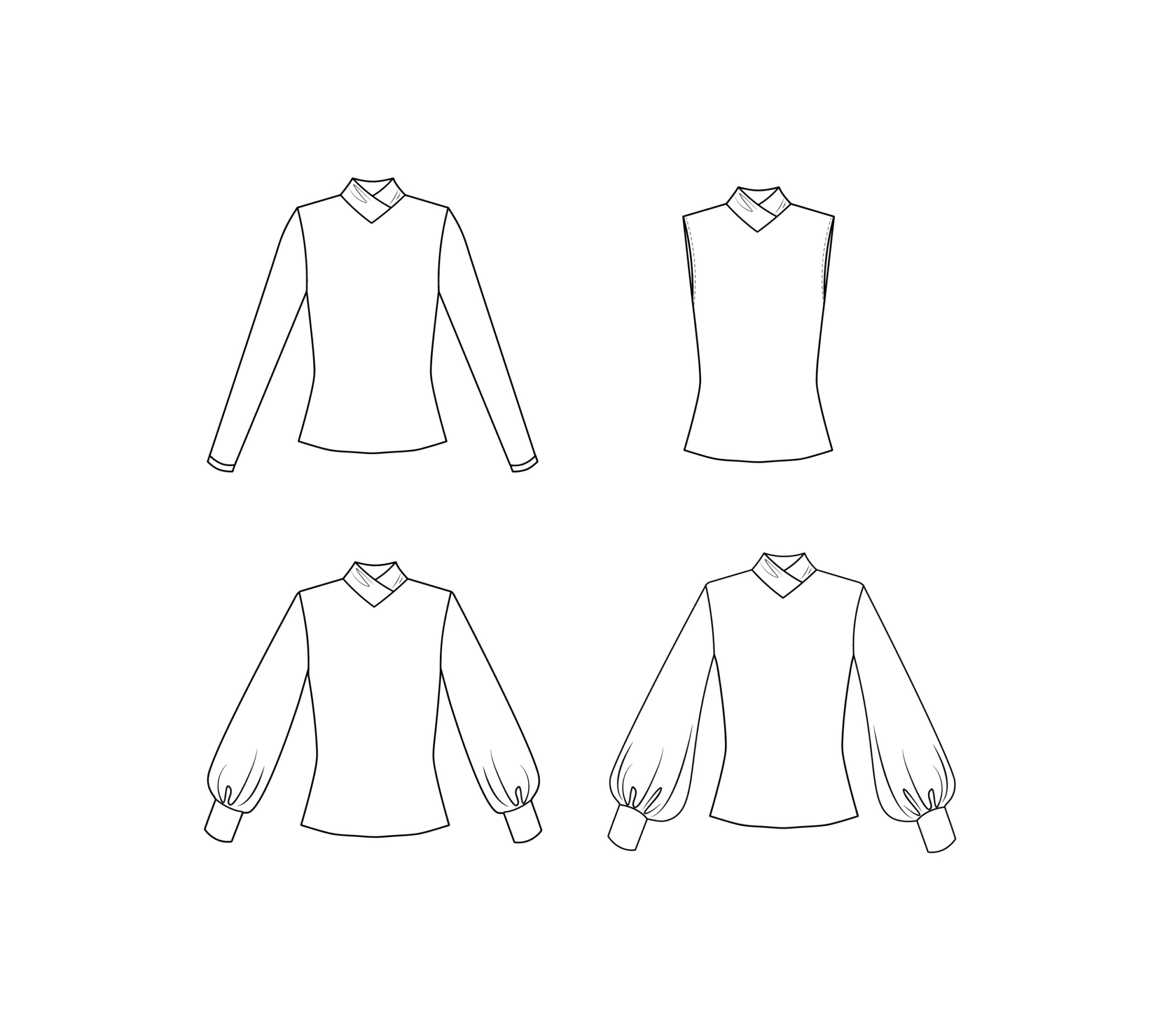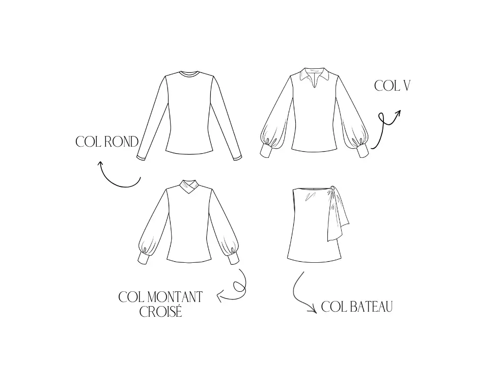 4 coupes essentielles — col rond, col montant croisé, col bateau et col V — et 4 types de manches — simples, bouffantes, extra bouffantes ou sans manches — pour créer des pièces à votre image.
