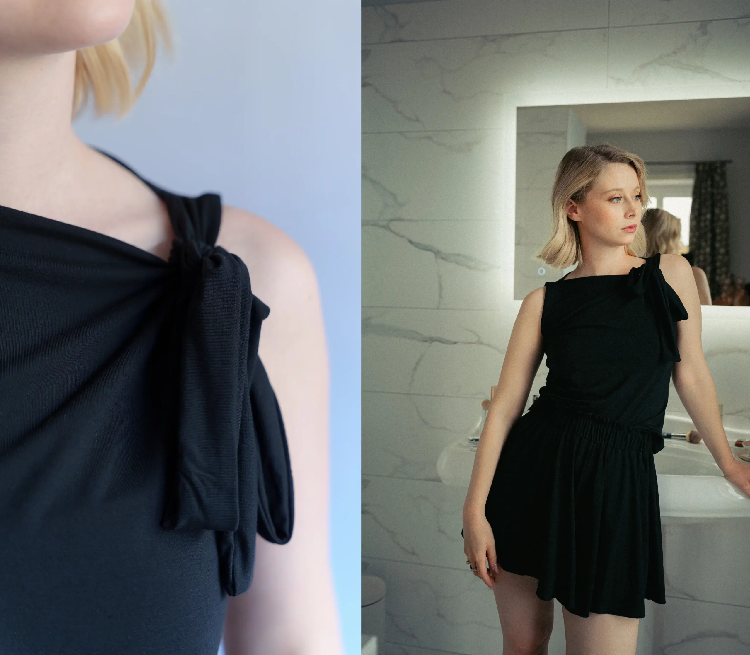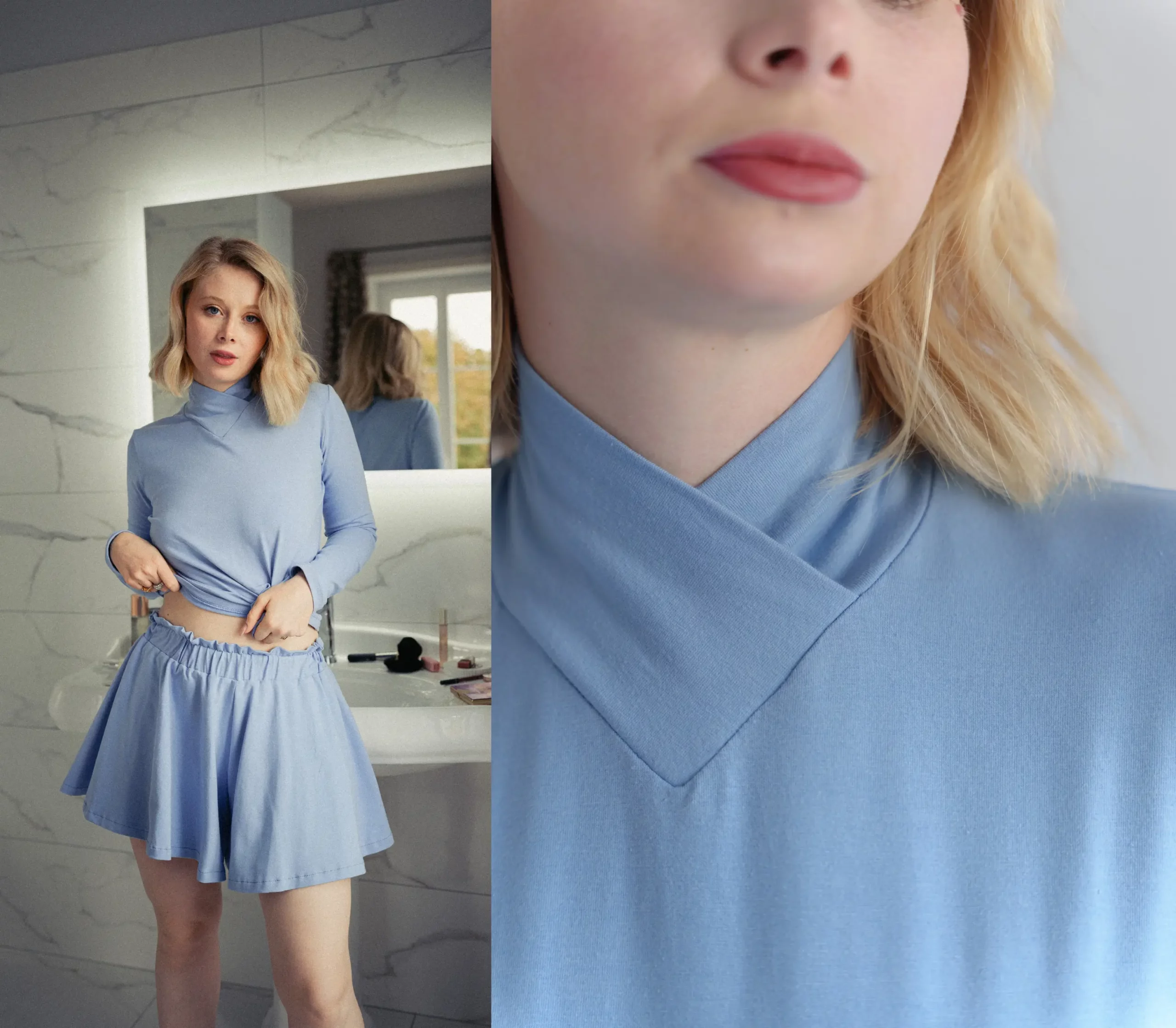 - Top col croisé, version avec manches (bouffantes), sens d’élasticité perpendiculaire à la laize: 1m70 sur 1m40