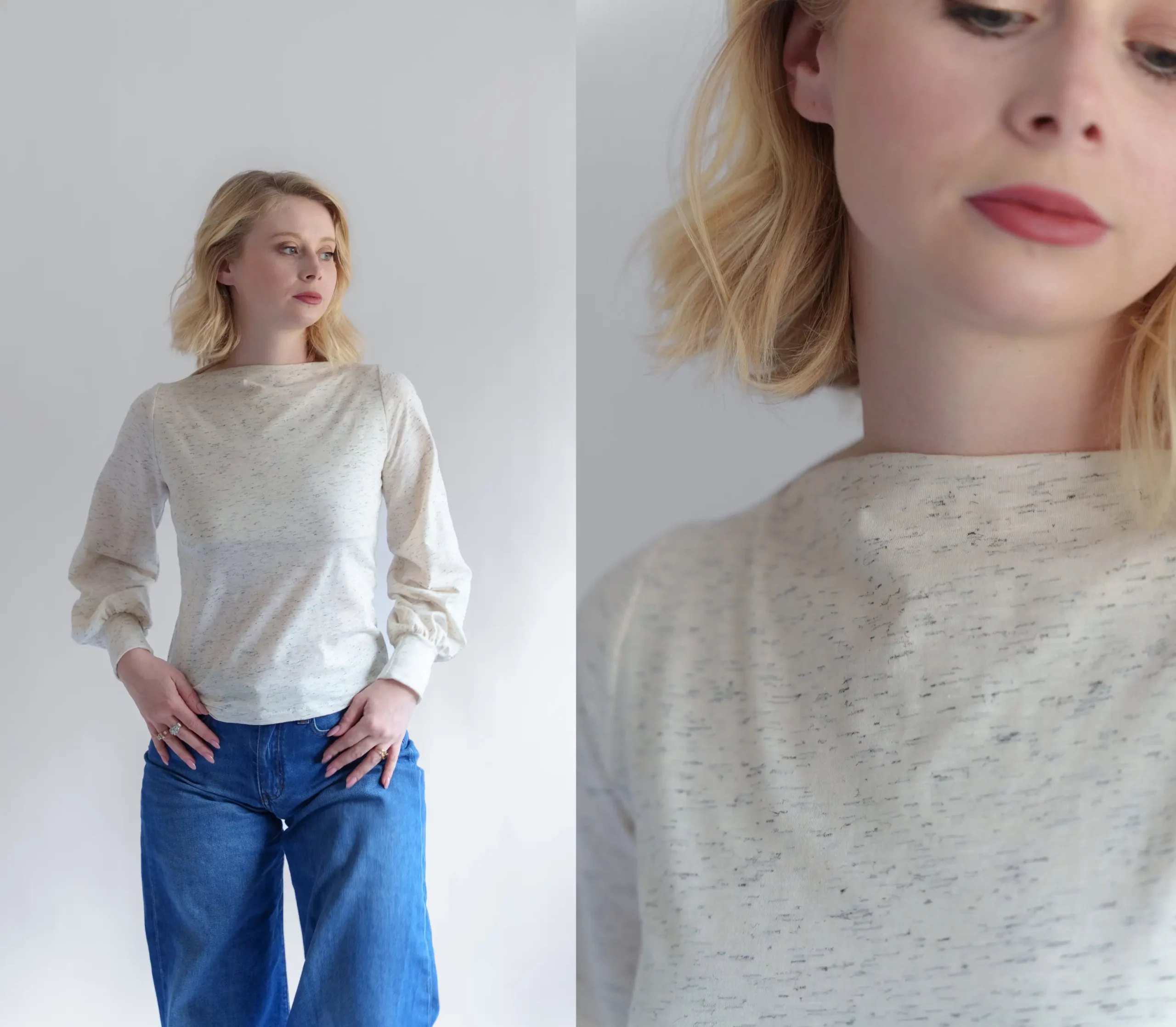 - Top encolure bateau, version avec manches (bouffantes), sens d’élasticité perpendiculaire à la laize: 2m sur 1m40